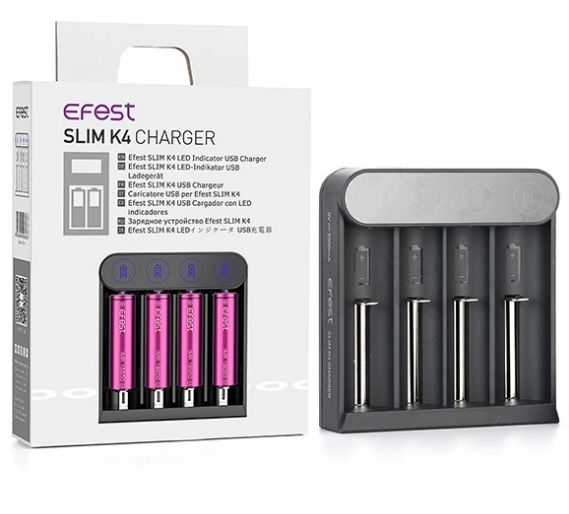 Discover the Efest SLIM K4 USB-C Charger, a 4-bay intelligent charger with Type-C powering, accepting a myriad of battery sizes with rapid charge function. Constructed from flame retardant ABS materials, the SLIM K4 USB-C Charger allows for rapid and safe charging thanks to the Type-C Port at the back, providing up to 2000mAh when used with 2 bays, relegating 1000mAh for each bay. When all four bays are used, charging is reduced to 500mAh per slot. Certified by FCC, RoHS, and CE, the Efest SLIM K4 is loaded with safeties and protections that will keep the charger, installed batteries, and user safe from failure.