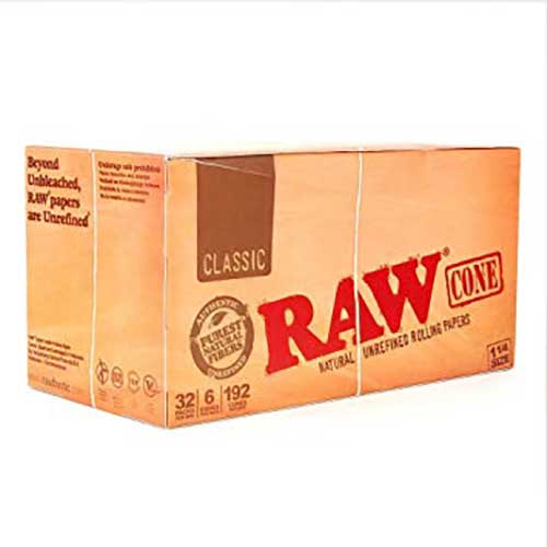 RAW Pre-Rolled Cones are made from hemp fiber papers with Hemp based gum. King and 1.25 Sizes. RAW are pure, less processed rolling papers unlike anything that you have ever seen or smoked. Because they contain a hybrid blend of unbleached (not chlorine whitened) fibers, the paper is a translucent natural light brown color. RAW is so thin that you can see through it. Each paper is watermarked with a patented CrissCross watermark. This special watermark helps prevent runs and maintains the smooth even-burning characteristics that we are famous for. RAW is available in many sizes and styles to suit the most discerning smoking connoisseur. Enjoy your favorite smoke in its purest RAW form.