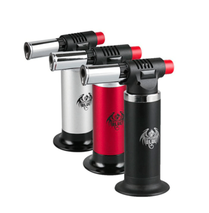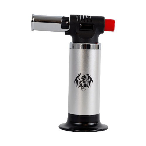 The Special Blue Torch Lighter – Fury Model stands 5.5″ tall and rests upright on its built-in base. This refillable butane torch features auto ignition, an adjustable flame, and an ergonomic design. This model works at any angle, refills quickly, is cordless and lightweight.